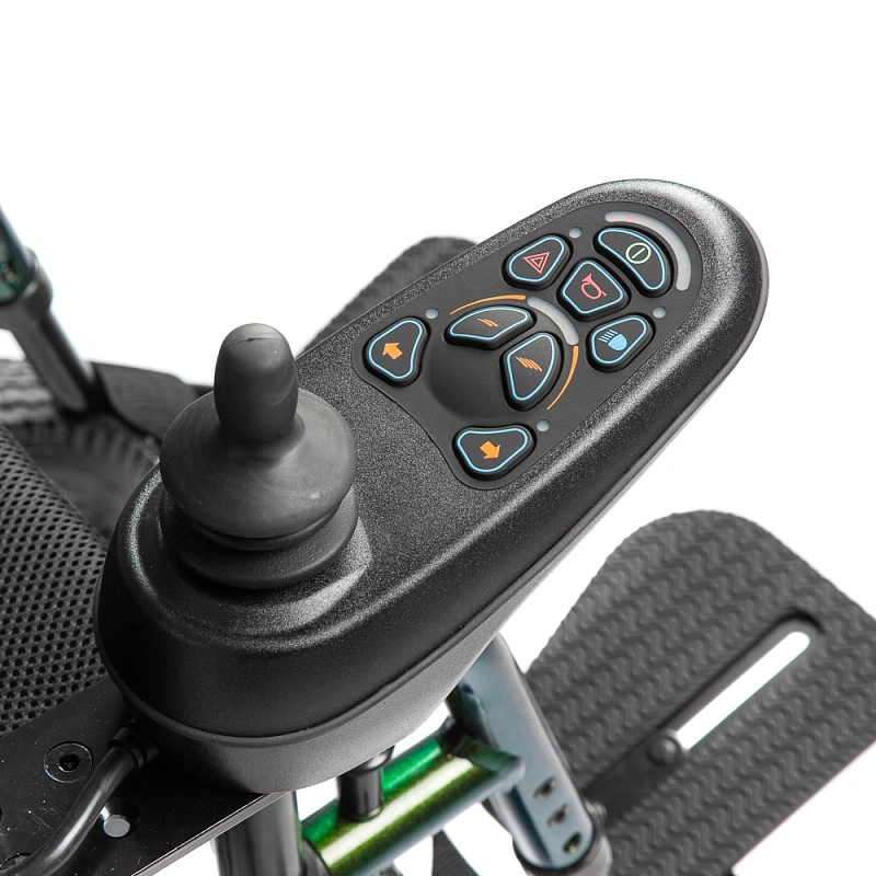 • На подлокотнике установлен многопозиционный пульт для самостоятельного управления коляской, с возможностью установки, как под левую, так и под правую руку