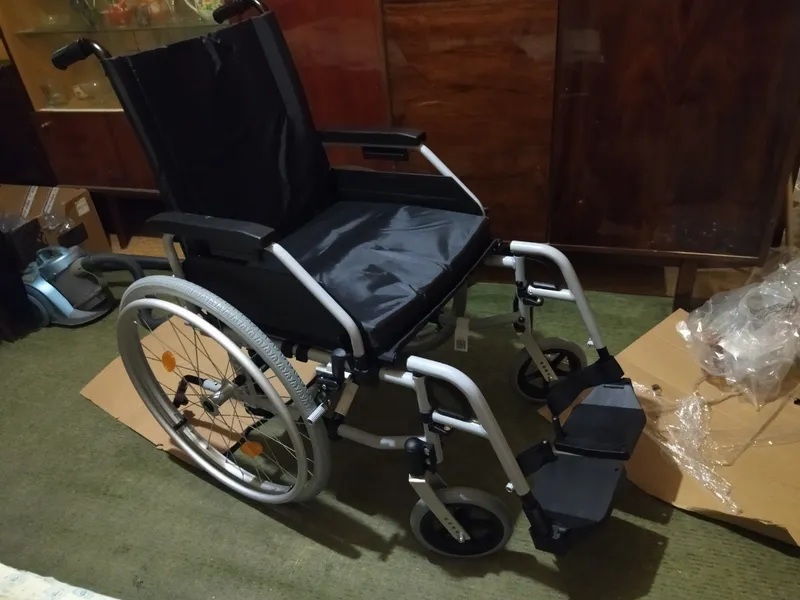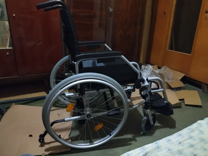 Эта коляска очень порадовала меня .Прислали в заводской, невскрытой упаковке. В комплекте есть подушка, подножки и антиопрокидыватели. Взял коляску с шириной сиденья 40 см , поэтому она проезжает в ванную комнату с шириной дверного проёма 58 см.